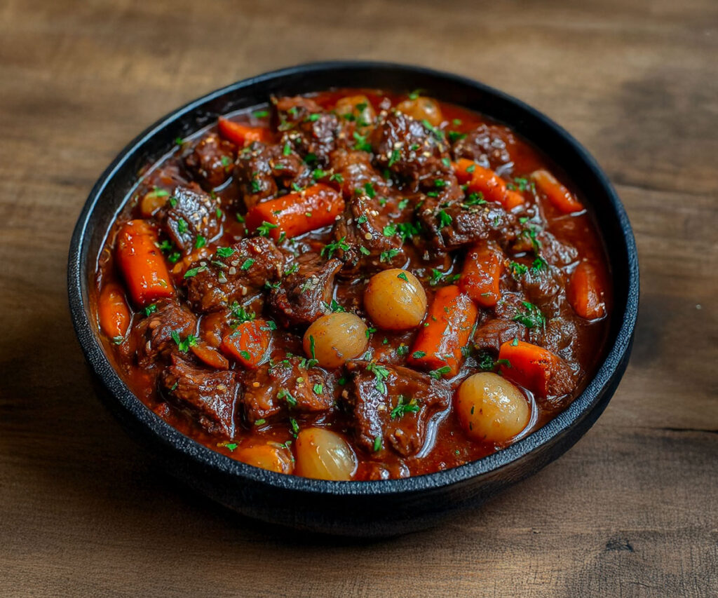 Toto jedlo pozostáva z kusov hovädzieho mäsa známych ako „dusené hovädzie mäso“, ktoré sú často úspornejšie, ale vďaka dlhému a pomalému vareniu sa stávajú neuveriteľne krehkými. V kombinácii s rozplývajúcou sa mrkvou, jemnými zemiakmi a voňavou omáčkou z červeného vína a byliniek vytvárajú kompletné a chutné jedlo, ideálne pre celú rodinu.