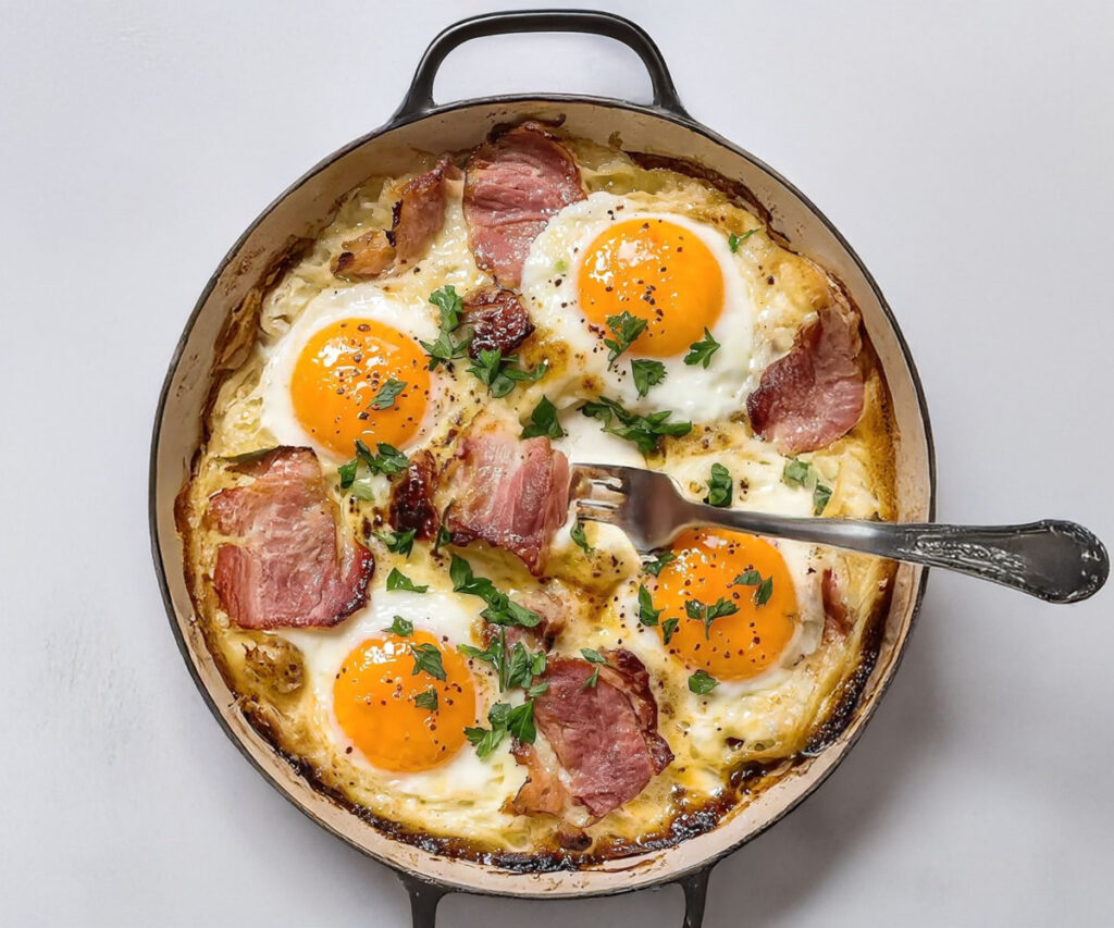 V tomto recepte je vajíčko ozdobené rustikálnou oblohou zo zlatistej slaniny, zmäknutej cibule a štipky cesnaku. Celé je to poliate jemnou crème fraîche, posypané trochou strúhaného syra a varené vo vodnom kúpeli pre dokonalú textúru: čerstvo stuhnutý bielok a ešte tekutý žĺtok. Práve toto jemné varenie robí toto jedlo takým magickým.