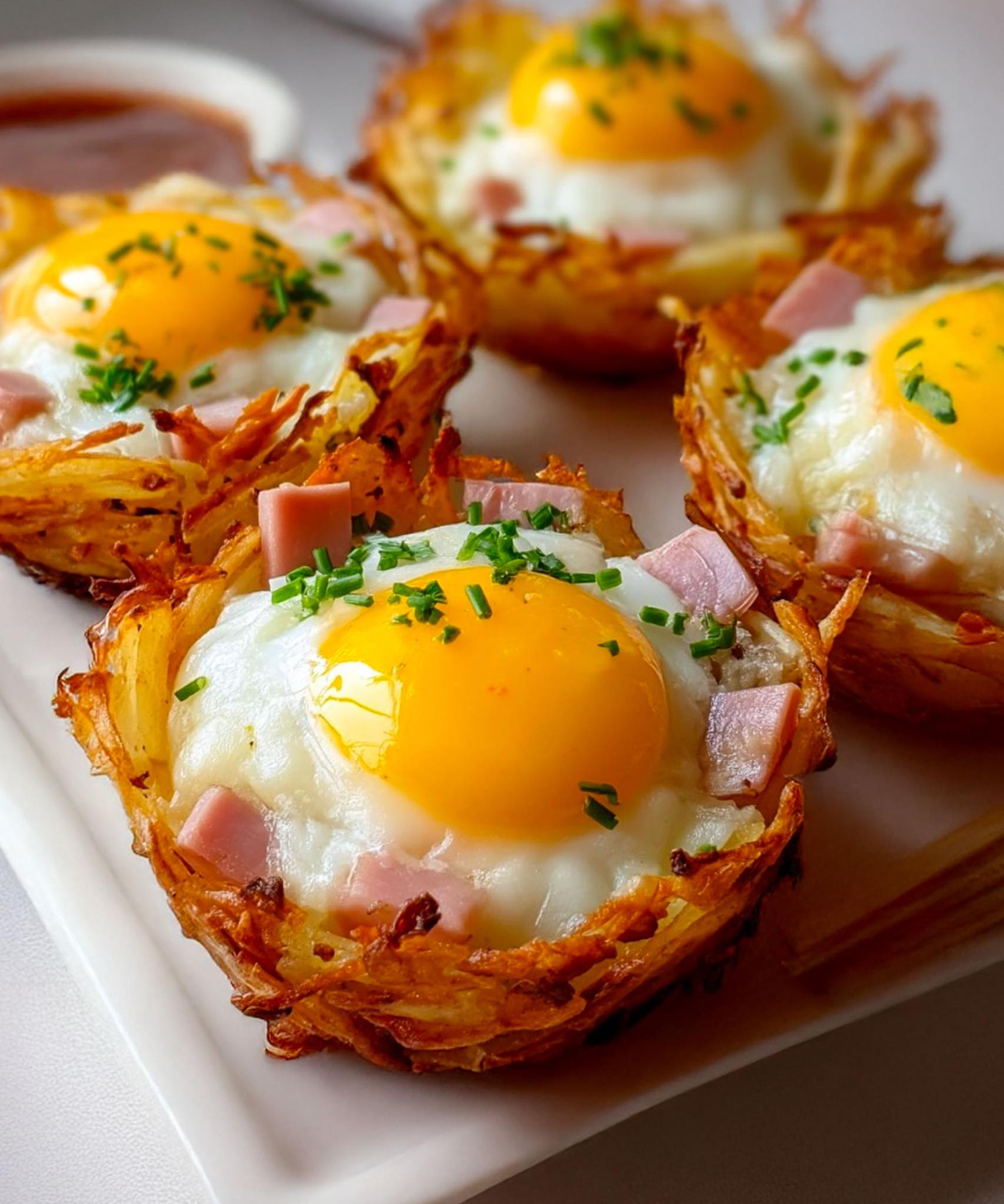 Inšpirované americkými zemiakovými plackami alebo švajčiarskymi rösti, tieto malé hniezdočká ponúkajú francúzsky pohľad na brunch alebo slané raňajky. Kombinácia zlatistých zemiakov, tekutého žĺtka, chutnej šunky a roztopeného syra je jednoducho neodolateľná. Každé sústo je dokonalou rovnováhou textúr a chutí.