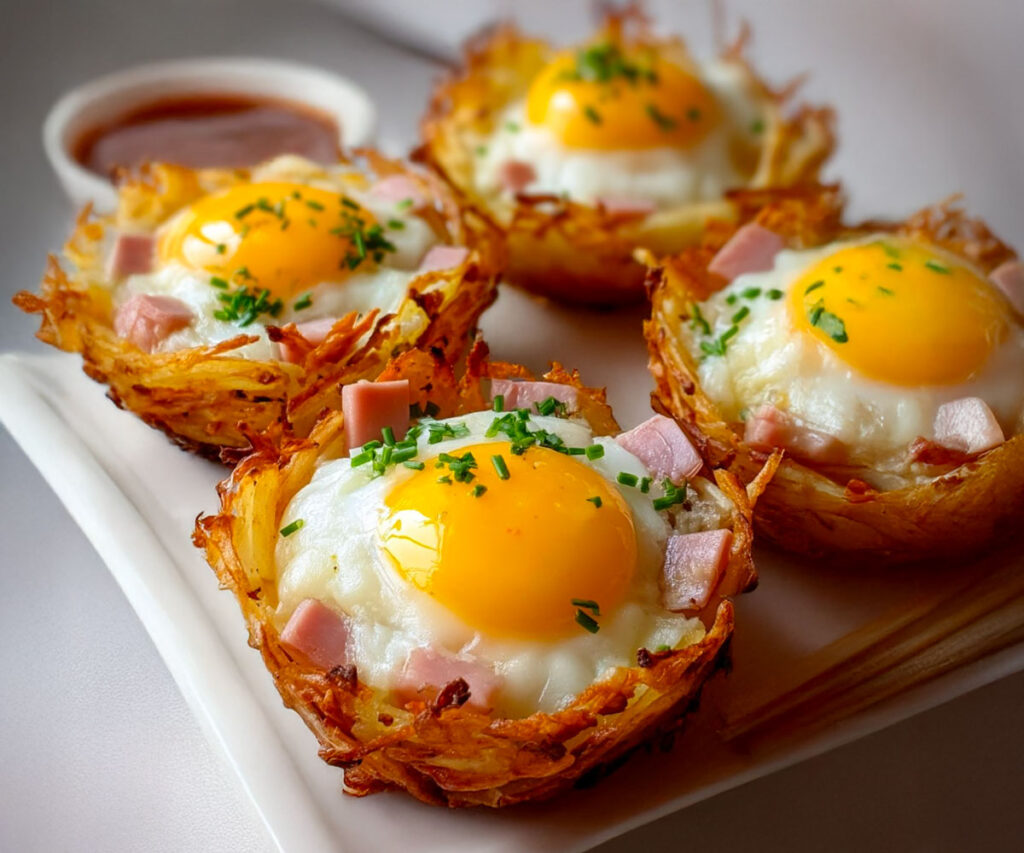 Inšpirované americkými zemiakovými plackami alebo švajčiarskymi rösti, tieto malé hniezdočká ponúkajú francúzsky pohľad na brunch alebo slané raňajky. Kombinácia zlatistých zemiakov, tekutého žĺtka, chutnej šunky a roztopeného syra je jednoducho neodolateľná. Každé sústo je dokonalou rovnováhou textúr a chutí.