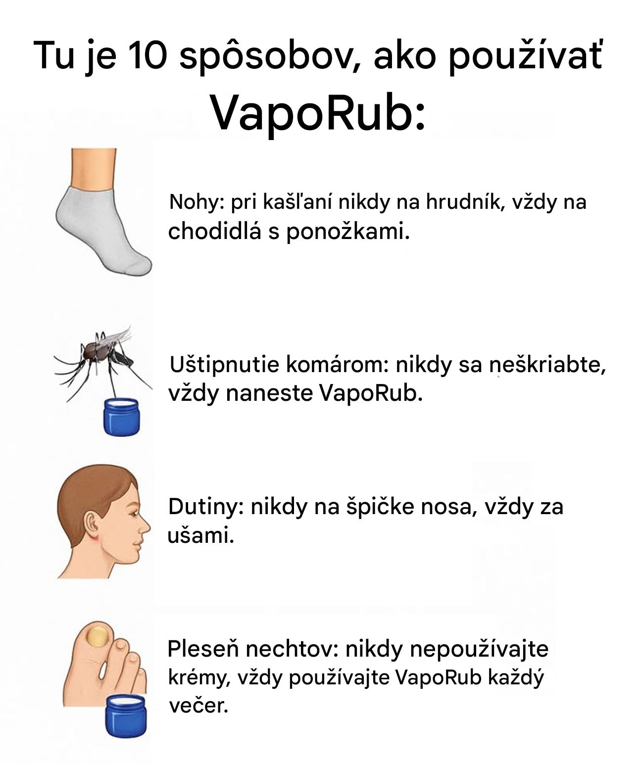 Vicks VapoRub často leží v zadnej časti lekárničky a vytiahne sa len vtedy, keď je upchatý nos alebo sa objaví kašeľ. Napriek tomu má táto malá nádobka s okamžite rozpoznateľnou vôňou oveľa viac využití, než si dokážete predstaviť. Používa sa už celé generácie a stal sa súčasťou mnohých denných rutín, niekedy ďaleko od svojho pôvodného účelu. Tu je 10 prekvapivých a praktických použití, ktoré by mohli zmeniť váš pohľad naň.
