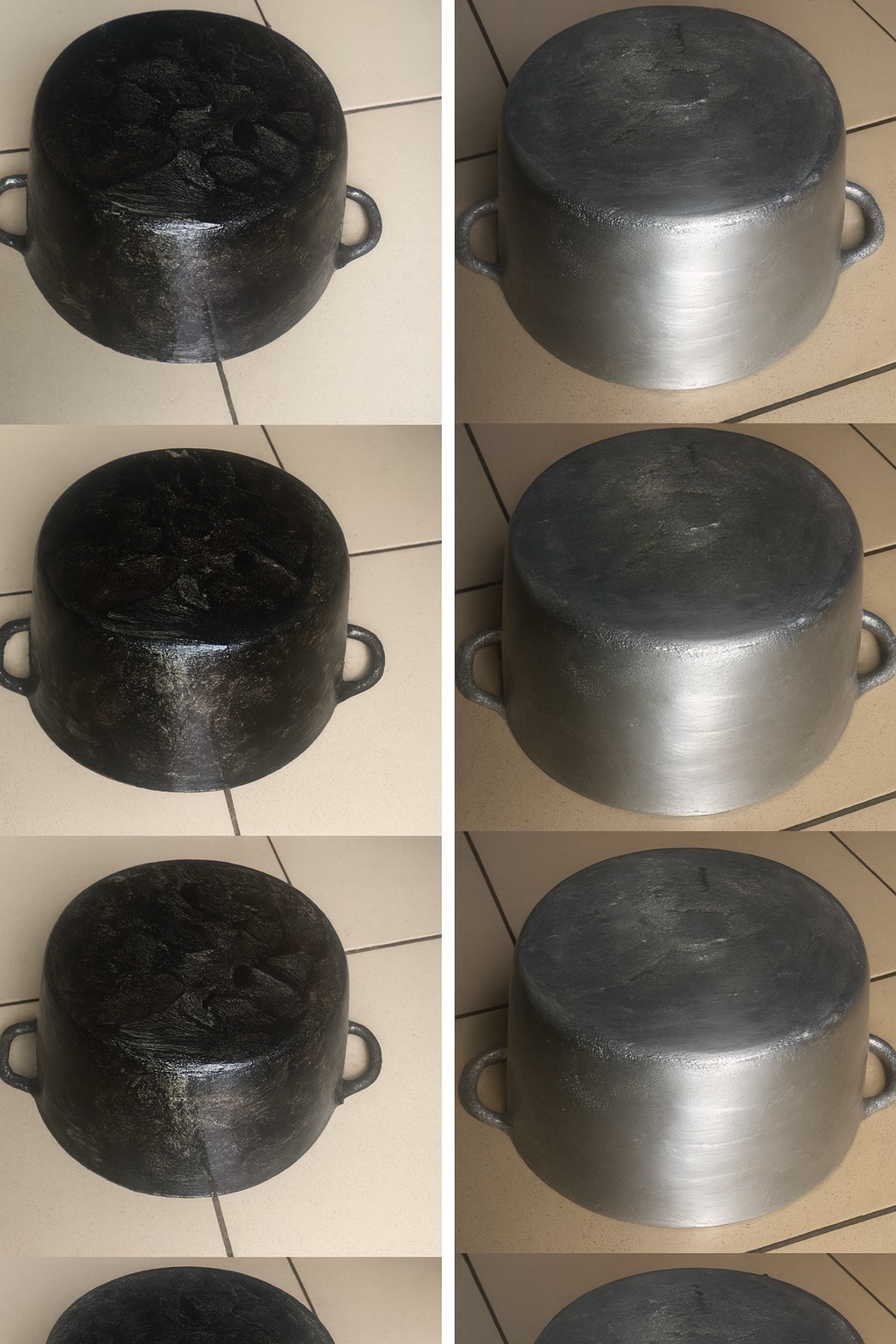 Nasypte hrubozrnnú soľ na povrch panvice a potom ju vtierajte kúskom zemiaka krúživými pohybmi 3 minúty. Potom umyte ako zvyčajne.