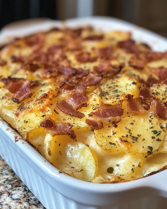 Ach, zapekané zemiaky – jedlo, ktoré pripomína rodinné stretnutia a nedeľné večere u babičky. Tento bylinkami napustený zapekaný zemiakový kastról je variáciou na klasiku, ktorá kombinuje krémovú chuť tradičných zapekaných zemiakov s pikantnou chuťou byliniek a chrumkavej slaniny. Je to ten druh jedla, ktoré zahreje srdce a naplní dušu, ideálne na chladný večer, keď chcete niečo upokojujúce a výdatné. Nálev z tymianu a rozmarínu dodáva nádych elegancie, zatiaľ čo údená paprika mu dodáva jemný šmrnc. Tento kastról je dôkazom bohatých kulinárskych tradícií Stredozápadu, kde sa jednoduché ingrediencie premieňajú na niečo výnimočné.