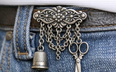 Túto zdobenú kovovú sponu s visiacimi retiazkami a miniatúrnym náradím som našla na dražbe. Vyzerá ako šperk, ale má pripevnené drobné nožničky.