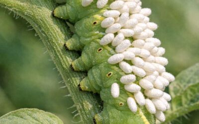Na rastlinách som zbadal túto veľkú zelenú húsenicu pokrytú bielymi stojacimi vecami. Je to huba alebo vajíčka? Mám ju odstrániť?