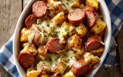 Táto zapekaná syrová klobása a zemiaky pečené v rúre je teplé a upokojujúce jedlo, ktoré je ideálne na chladné večery…