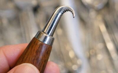 Malý kovový nástroj s hákovitým, zúbkovaným koncom a drevenou rukoväťou. Našiel som ho pomiešaný so starým strieborným príborom. Príliš ostrý na lyžicu, príliš zakrivený na nôž.