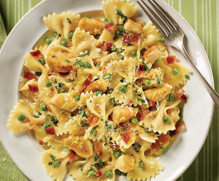 Cestoviny s kuracím mäsom a hráškom sú farebným a chutným obľúbeným talianskym rodinným jedlom. Tento jednoduchý recept kombinuje jemné kuracie mäso, jemný zelený hrášok a bohatú, krémovú parmezánovú omáčku s štipkou citrónovej kôry. Vajcia a smotana všetko spoja a vytvoria hodvábnu textúru podobnú vegetariánskej carbonare.