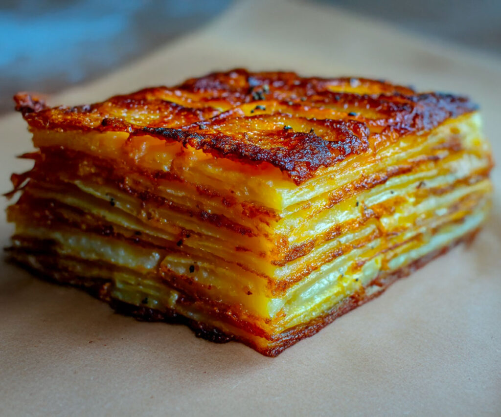 Tento recept je výnimočný vďaka dokonale zvládnutej súhre textúr. Každý tenko nakrájaný zemiak nasiakne rozpusteným maslom a bezproblémovo sa prelína so susednými zemiakmi, čím vytvára slané mille-feuille s takmer geometrickou presnosťou. Po vybratí z formy zlatá veža odhalí svoje čisté vrstvy a sľubuje pokrm, ktorý je zároveň upokojujúci a rafinovaný.