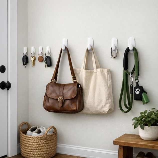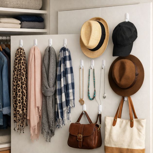 Skrine sa môžu rýchlo stať chaotickými, ale háčiky na ovládanie ponúkajú jednoduché riešenie. Použitím malých háčikov na stenách alebo vnútorných dverách môžete vytvoriť vertikálny úložný priestor na doplnky, ako sú klobúky, šatky a šperky.