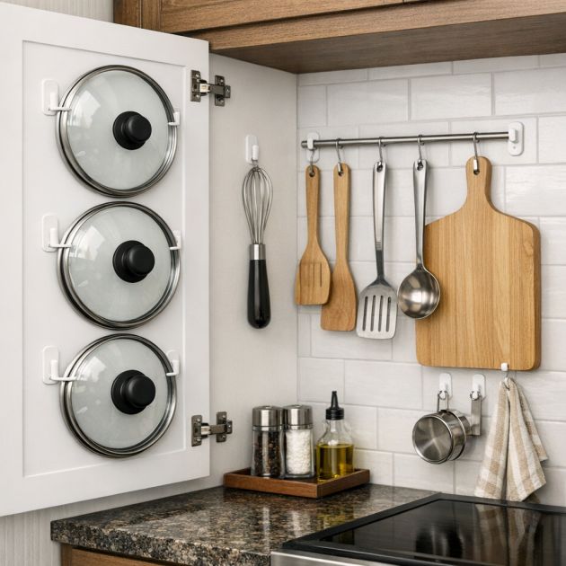 Organizácia kuchyne si často vyžaduje kreatívne riešenia, najmä v malých priestoroch. Háčiky na ovládanie môžu pomôcť využitím vertikálneho priestoru vo vnútri skriniek alebo na stenách. V prípade pokrievok od hrncov umiestnite stredne veľké háčiky na vnútornú stranu dvierok skriniek, vzdialené od seba asi 25 cm, aby pokrievky držali na mieste.