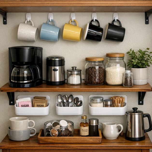 Pripravte si poličku alebo vozík s kávovarom a riadom a pomocou držiakov na cukor, lyžičky a ďalšie potrebné veci si uložte do kuchynského riadu. Táto kávovarová stanica svojpomocne udrží vašu kuchyňu poriadok a zároveň dodá vášmu interiéru osobný nádych.
