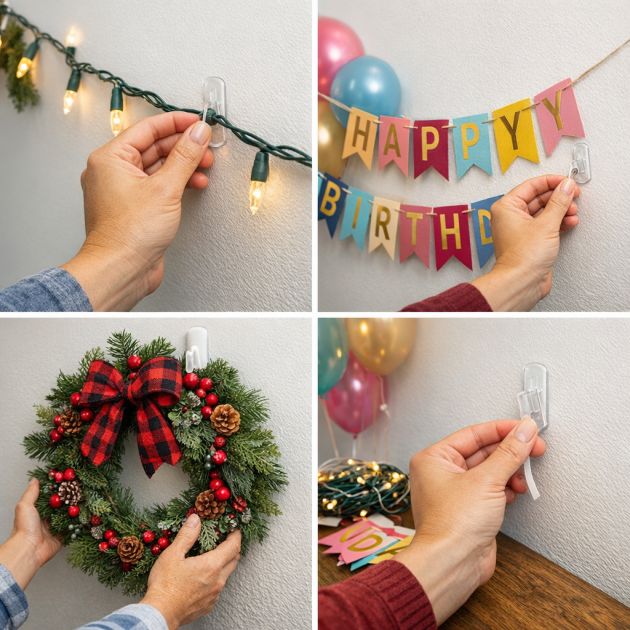 Zdobenie na sviatky a večierky je radosť, ale výsledok môže byť skľučujúci. Háčiky na zavesenie uľahčujú zavesenie girland, svetiel a bannerov bez poškodenia. Malé háčiky sú ideálne na šnúrové svetlá, zatiaľ čo stredné háčiky unesú ťažšie dekorácie, ako sú vence.