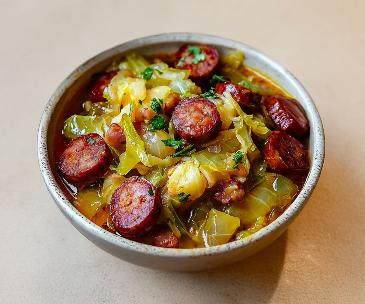 Kombinácia jemne dusenej kapusty kelovo-hnedej a zlato-hnedých údených klobás ponúka absolútne neodolateľný kontrast textúr a chutí. Kapusta sa stáva mäkkou a voňavou vďaka pomalému vareniu vo vývare ochutenom bielym vínom a celozrnnou horčicou, zatiaľ čo klobásy prispievajú svojou bohatou údenou chuťou. Každé sústo je skutočnou lahôdkou pre chuťové poháriky.