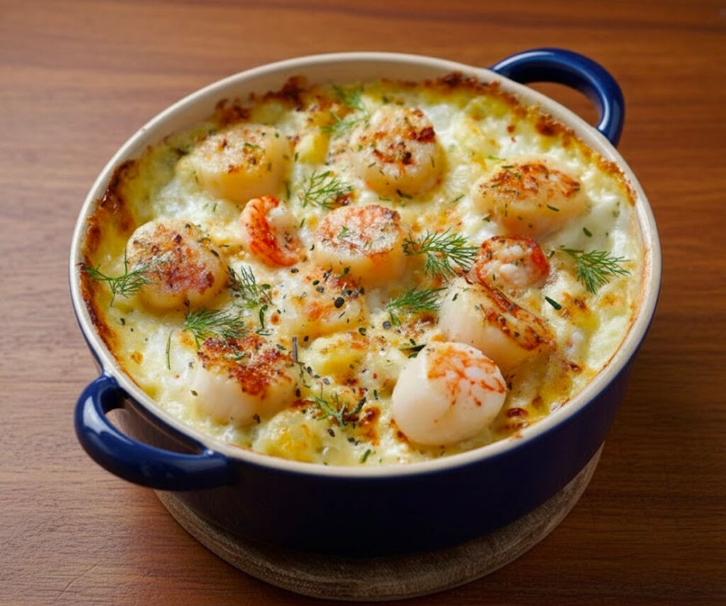 Tento gratinovaný pokrm predstavuje dva morské poklady: jemné, mierne sladké mušle a krevety, ktoré dodávajú chuť a textúru. Spolu vytvárajú vyvážené duo, ktoré umocňuje krémová omáčka z bieleho vína a štipka cesnaku a šalotky. Celé jedlo je posypané strúhaným syrom a voliteľné tenkou vrstvou strúhanky pre zlatistý, chrumkavý, ktorý si každý zamiluje.