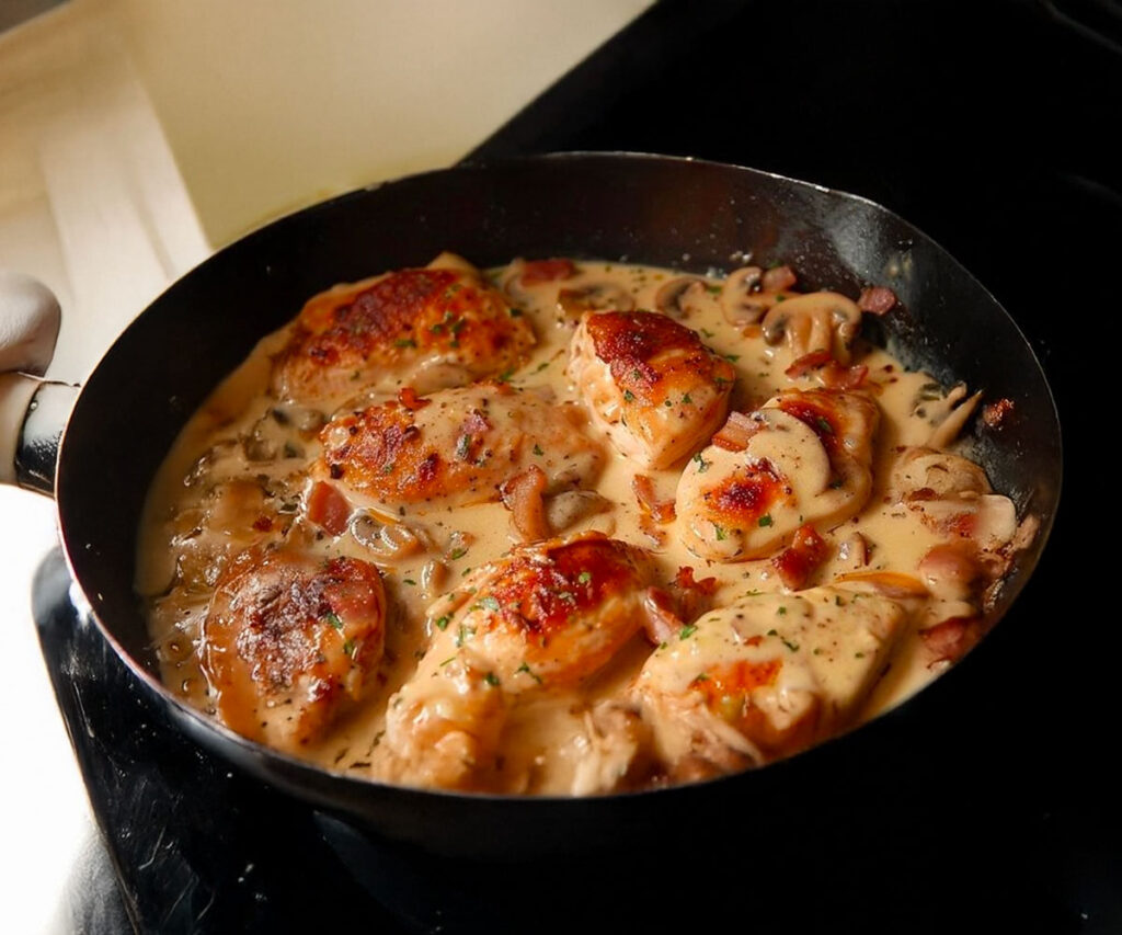 Toto jedlo sa vyznačuje jemnou omáčkou, dokonale dochutenou horčicou a zjemnenou smotanou. Údená slanina dodáva slaný, rustikálny nádych, zatiaľ čo huby zaručujú drevitý, na jazyku sa rozplývajúci nádych. Spolu tvoria neodolateľné trio, ktoré sa dokonale hodí k jemnému, na panvici vyprážanému kuraciemu mäsu.