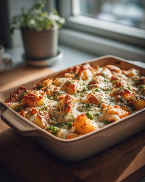 Zapekané kuracie mäso so syrom a zemiakmi v rúre je chutné jedlo inšpirované klasickými receptami na zapekané jedlá. Toto jedlo kombinuje výdatnosť kuracieho mäsa a zemiakov s krémovou a lahodnou textúrou roztopeného syra, čím vytvára ideálne jedlo na rodinné stretnutia alebo na útulný večer doma. Pridanie sýteho zeleného hrášku nielenže dodáva chuťový akcent, ale prináša aj nádych sladkosti, ktorý vyvažuje slané chute. Tento recept pripomína tradičné jedlá Stredozápadu, kde sú zapekané jedlá základnou súčasťou jedál, ktoré ponúkajú teplo a výživu. Je to jedlo, ktoré je úžasne prispôsobivé a umožňuje vám experimentovať s rôznymi syrmi alebo ďalšou zeleninou, vďaka čomu je všestrannou voľbou pre každú príležitosť.