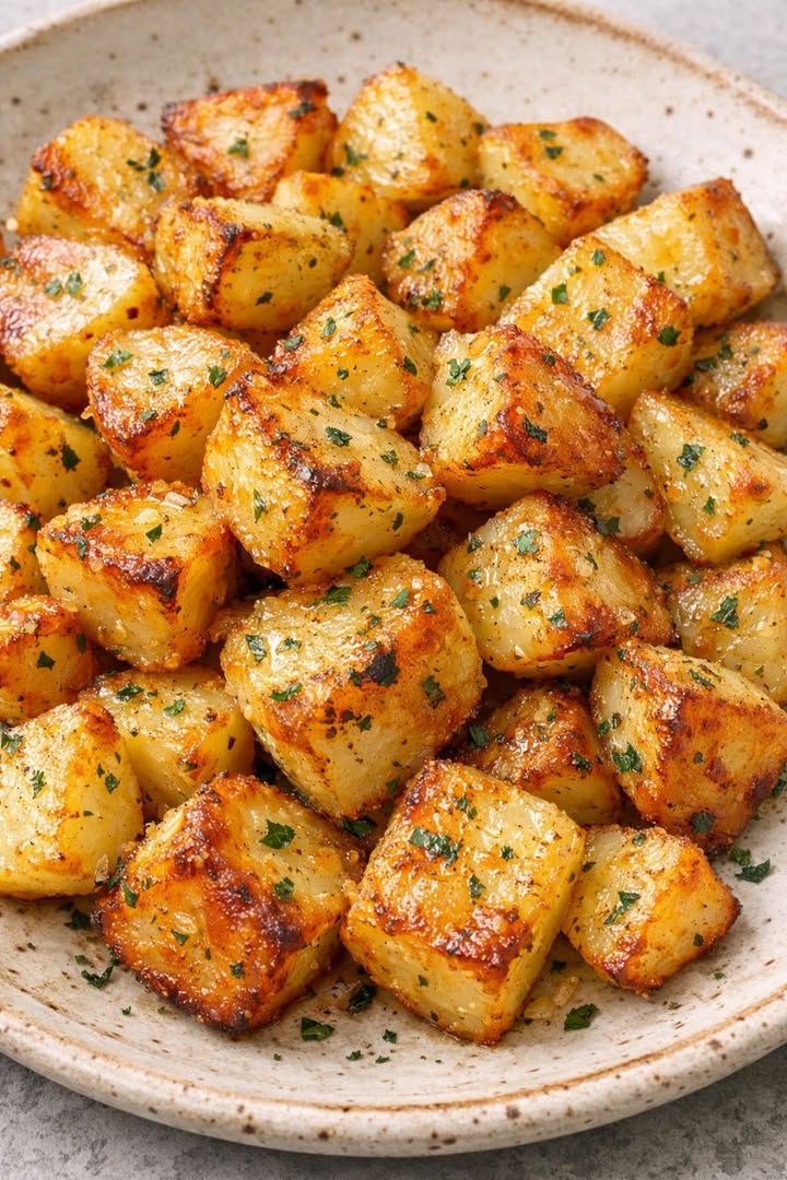 Túto metódu mi pred rokmi odovzdala milá amišská pani na našom miestnom farmárskom trhu a odvtedy som zemiaky inak nerobil. Je to také jednoduché a úprimné, ako to opísala: len zemiaky, maslo, soľ a štipka sušenej petržlenovej vňate. Trik spočíva v tom, ako ich pečiete – v horúcej rúre, s dostatkom miesta a bez námahy. Výsledkom je veľký kameninový tanier s chrumkavými, zlatistými kúskami zemiakov, lesklými od masla a posiatymi zelenými škvrnami. Jedlo, ktoré sa skvele hodí na nedeľný stôl alebo ktorýkoľvek pracovný večer, keď chcete niečo teplé a upokojujúce bez veľa práce.