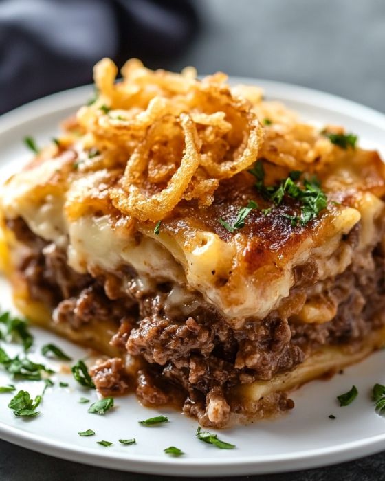 V srdci Stredozápadu, kde sú zimy dlhé a polia sa tiahnu, kam až oko dovidí, je jedlo, ktoré vám zlepší náladu, viac než len jedlo – je to spôsob života. Tento francúzsky kastról s cibuľou, hovädzím mäsom a cestovinami je pokrm, ktorý spája bohaté a pikantné chute karamelizovanej cibule a jemného hovädzieho mäsa, to všetko zasadené do lôžka z cestovín. Je to recept, ktorý pripomína jednoduchšie časy, keď sa rodiny stretávali okolo kuchynského stola, aby si vyrozprávali príbehy a zasmiali sa. Tento kastról je ideálny na chladné večery, keď potrebujete niečo výdatné a hrejivé. Je to jedlo, ktoré mi pripomína kuchyňu mojej starej mamy, kde vôňa cibule variacej sa pomaly a na miernom ohni bola prísľubom dobrých vecí, ktoré prídu.