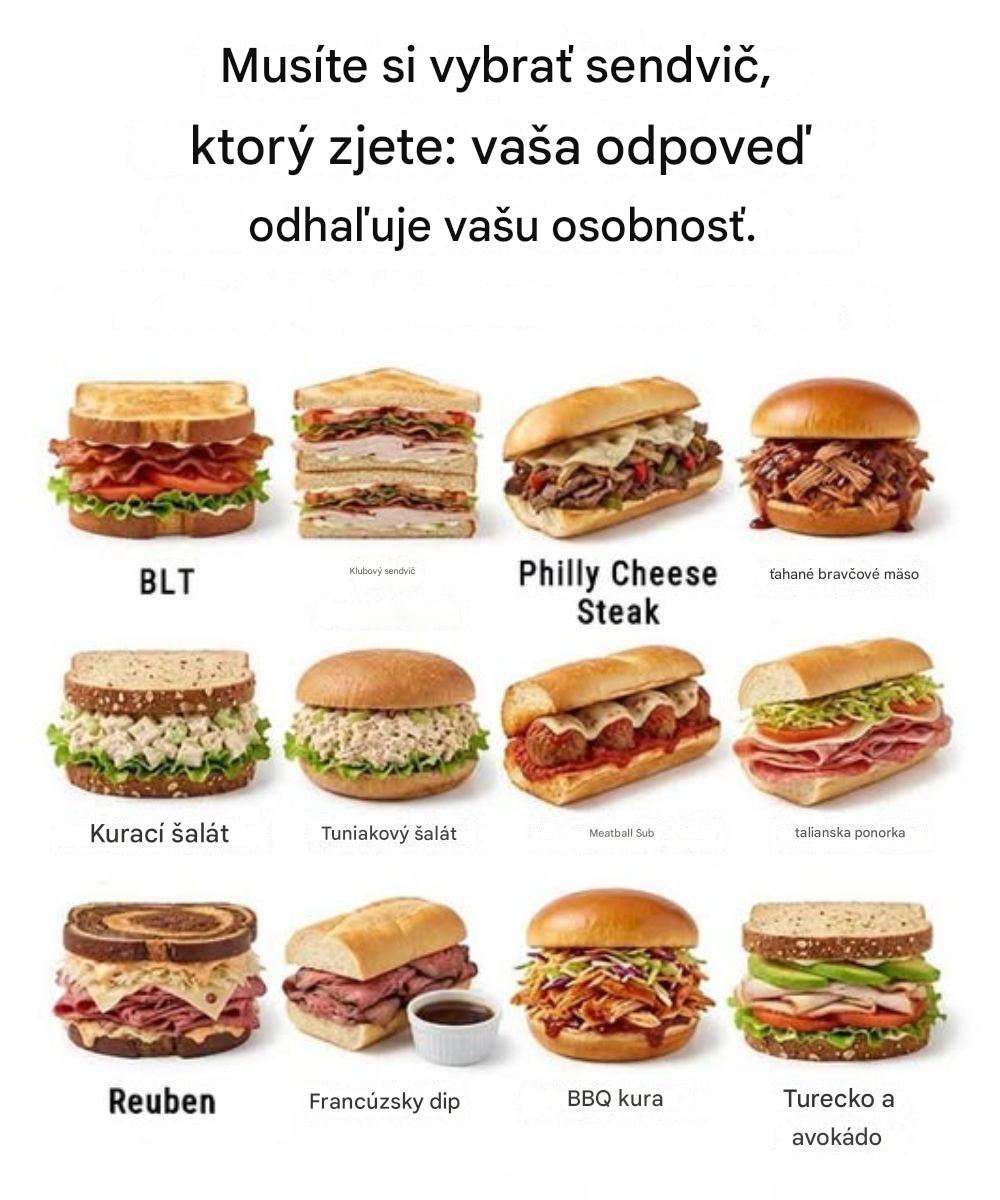 Čo keby jednoduchý sendvič, ako je ten váš, veľa hovoril o vašej osobnosti? Naše výbery jedál často odrážajú oveľa viac než len chuť: odhaľujú zvyky, hodnoty a dokonca aj charakterové vlastnosti. Pozrite sa na tieto sendviče. Ktorý by ste si vybrali?