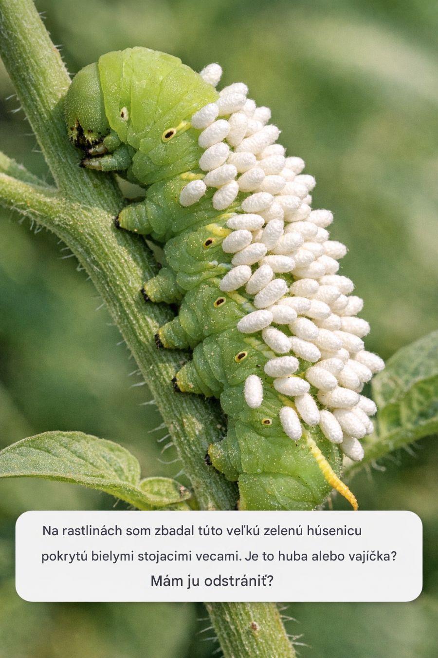 1. Čo vidíte: Paradajkový rohovník pokrytý bielymi kokónmi