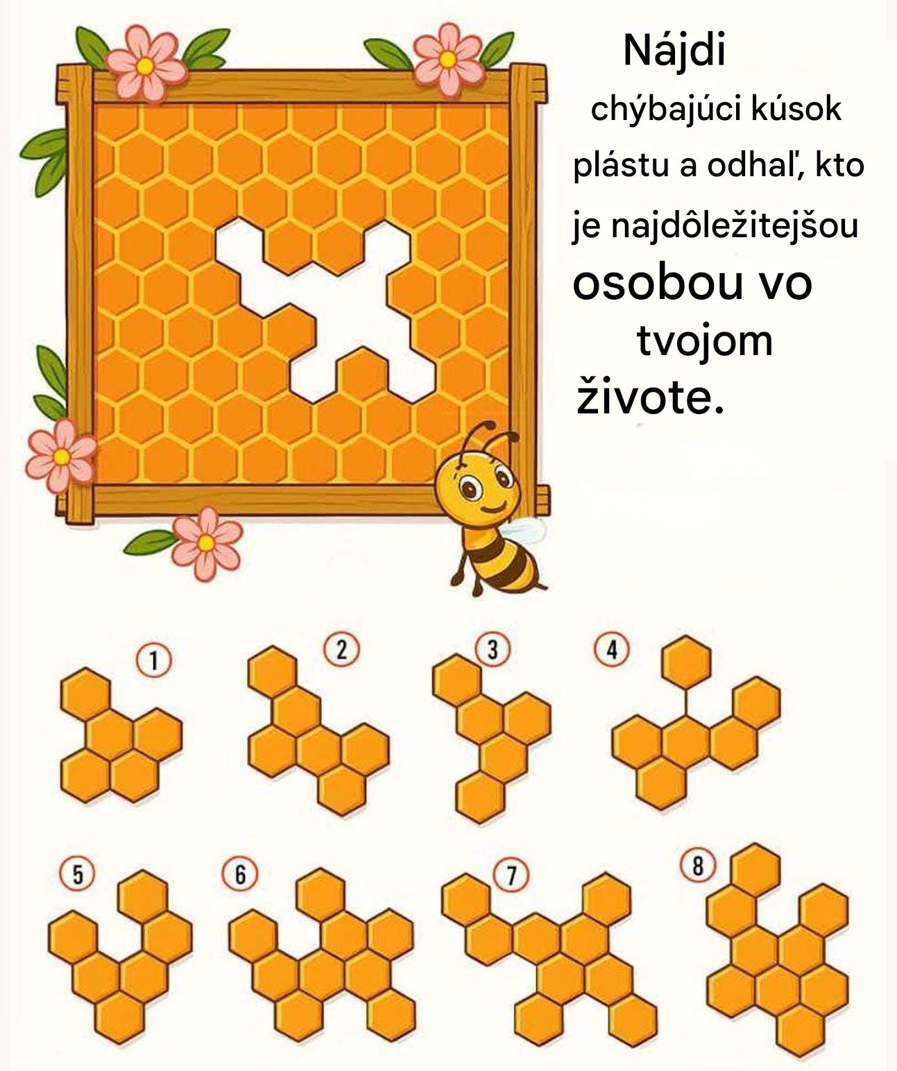 Stretli ste sa už niekedy s tými vizuálnymi testami, ktoré sa zdajú byť neškodné, kým neodhalia niečo neočakávané? Tento funguje rovnako. V skladačke vo forme plástu chýba dielik a máte osem možností. Vaša úloha sa zdá byť jednoduchá: inštinktívne si vybrať dielik, ktorý vyplní medzeru. Ale táto voľba by mohla odhaliť oveľa viac, ako si predstavujete... Čo prezrádza o osobe, ktorá s vami zdieľa život v širšom zmysle – priateľ, milovaná osoba alebo tichá, každodenná opora? Zostaňte naladení...