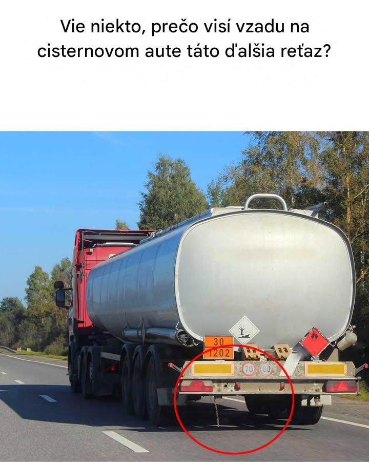Dodatočná reťaz visiaca zo zadnej časti cisternového vozidla slúži ako uzemňovacie zariadenie. Jej primárnym účelom je rozptýliť statickú elektrinu, ktorá sa môže hromadiť počas prepravy horľavých kvapalín. Počas pohybu vozidla môže trenie medzi kvapalinou a nádržou, ako aj pohyb samotného vozidla, generovať statickú elektrinu. Ak sa s týmto statickým nábojom správne nezaobchádza, môže viesť k iskrám, ktoré predstavujú značné riziko vznietenia horľavého nákladu. Reťaz sa ťahá po zemi a poskytuje cestu pre bezpečné vybitie statickej elektriny do zeme, čím sa znižuje riziko požiaru alebo výbuchu.