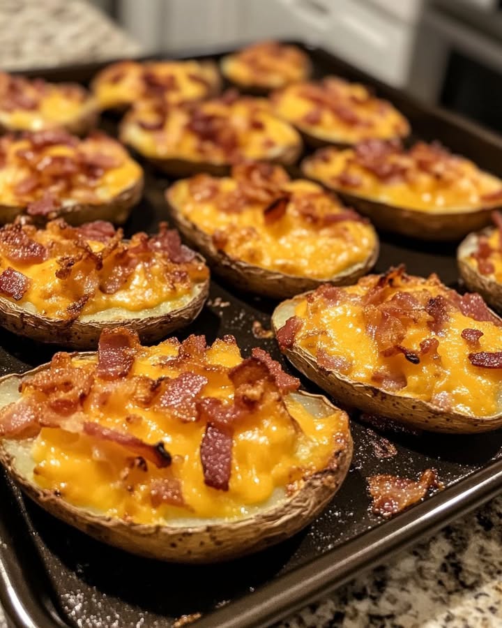 Zemiakové šupky na plechu sú lahodnou variáciou klasického predjedla, ideálne na stretnutia alebo útulný večer doma. Zemiakové šupky, ktoré pochádzajú zo Spojených štátov, sa stali populárnymi v 70. rokoch 20. storočia ako spôsob, ako zužitkovať zvyšky pečených zemiakov. Táto verzia zjednodušuje proces použitím plechu, čo uľahčuje servírovanie pre veľké množstvo ľudí. Chrumkavé šupky, doplnené roztaveným syrom, chrumkavou slaninou a kopčekom kyslej smotany, ponúkajú uspokojivú kombináciu chutí a textúr. Je to jedlo, ktoré prináša pohodlie a nádych nostalgie a zároveň je neuveriteľne všestranné.