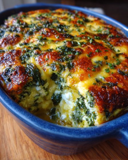 Tento raňajkový kastról so špenátom a fetou pečený v rúre je lahodným jedlom, ktoré spája jednoduché a výdatné chute Stredozápadu s nádychom stredomorského vkusu. Je to recept, ktorý mi pripomína nedeľné rána na farme, keď sa kuchyňa hemžila vôňou čerstvo upečených kastrólov, ktoré sú základom našich rodinných stretnutí. Kombinácia vajec, syra feta a špenátu vytvára krémovú a slanú lahôdku, ktorá je ideálna na začiatok dňa. Či už organizujete brunch alebo si chcete jednoducho dopriať špeciálne raňajky, toto jedlo určite zahreje vaše srdce a uspokojí vaše chuťové poháriky.