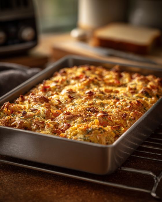 Tento kastról sa krásne hodí k čerstvému zelenému šalátu a chrumkavému chlebu. Ľahšiu verziu môžete podávať s dusenou zelenou fazuľkou alebo brokolicou, aby ste vyvážili bohatosť jedla. Ak organizujete večeru, pohár červeného vína alebo osviežujúci ľadový čaj dokonale doplnia slané chute.