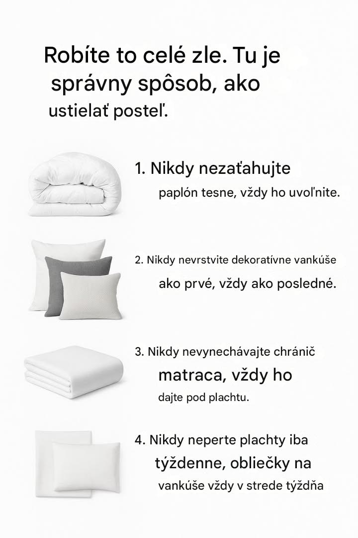 Ustlanie postele sa môže zdať ako jednoduchá úloha, niečo, čo sme všetci urobili nespočetnekrát bez väčšieho premýšľania. Spôsob, akým si posteľ ustielate, však môže v skutočnosti ovplyvniť kvalitu vášho spánku, životnosť vašej posteľnej bielizne a dokonca aj estetickú príťažlivosť vašej spálne. Ak ste sa niekedy pristihli, že frustrovane odkopávate prikrývky alebo sa budíte zamotaní v plachtách, možno je čas prehodnotiť svoj prístup k ustielaniu postele.