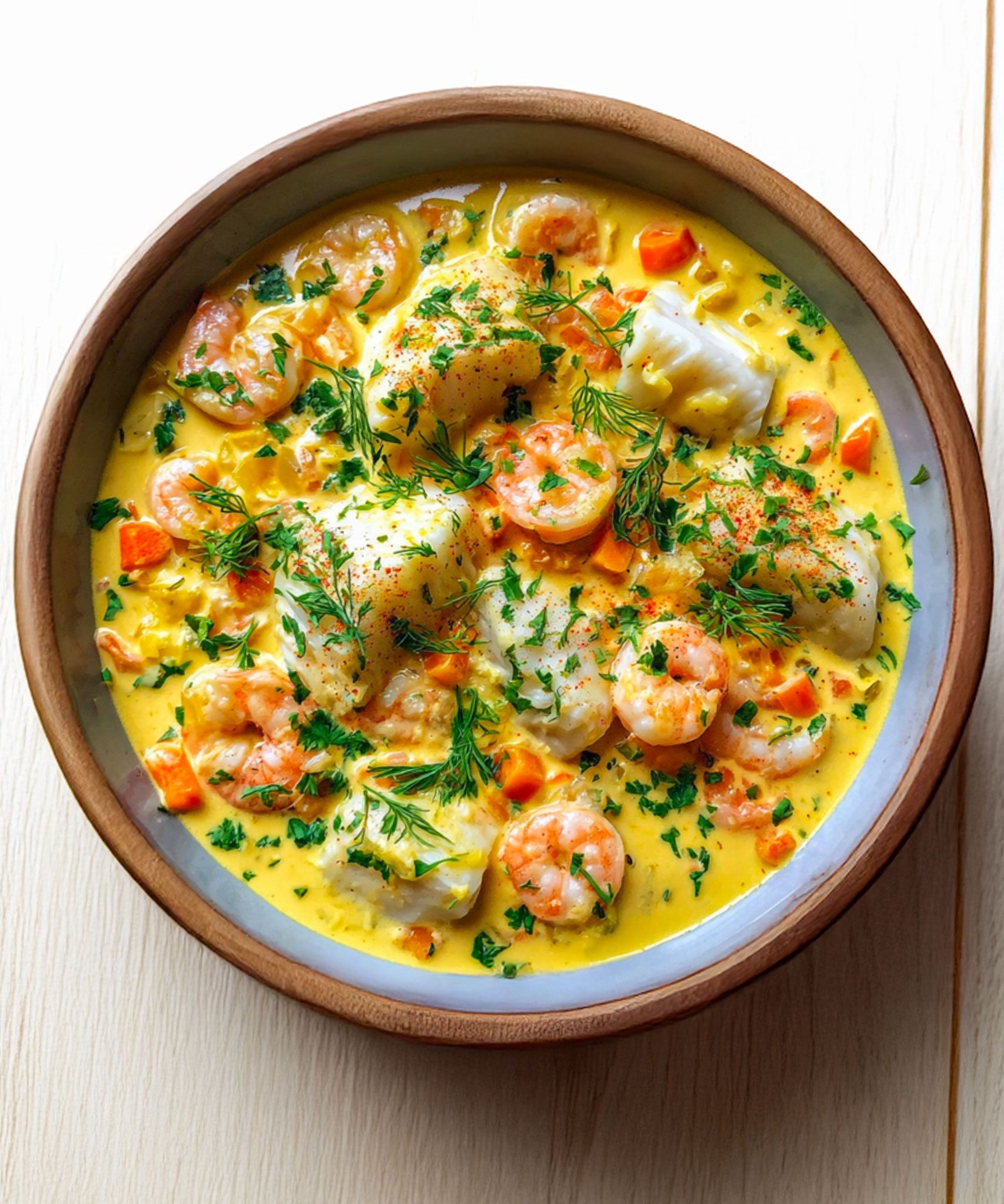 Jemná a delikátna biela ryba sa dokonale hodí k sladkosti kokosového mlieka, zatiaľ čo krevety dodávajú jemne pevnú textúru a neodolateľnú slanú chuť. Kari jedlu jemne dodá parfum bez toho, aby ho prehnalo, a vytvára tak vyváženú a chutnú omáčku. Je to jednoduchý, no zároveň jedinečný recept, ideálny na prelomenie rutiny bez akýchkoľvek starostí.