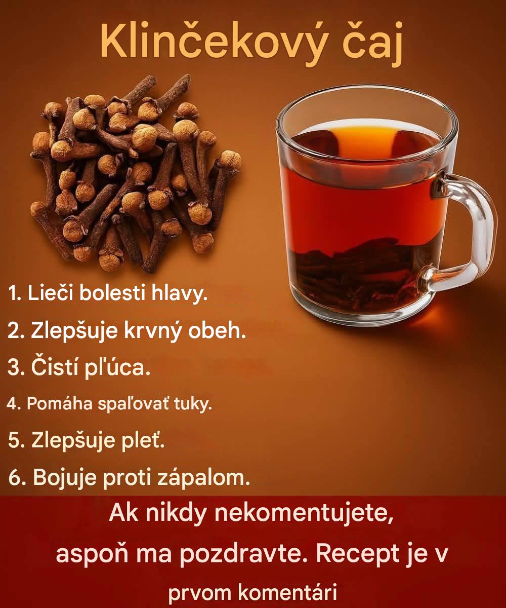 ZÁKLADNÁ SILA: Eugenol a bunkový štít Tajomstvom neuveriteľnej všestrannosti klinčekového čaju je eugenol. Táto silná fenolová zlúčenina, ktorá tvorí veľké percento prchavého oleja klinčeka, je biologicky ťažká váha. Pôsobí predovšetkým ako silný antioxidant a prírodný protizápalový prostriedok, ktorý je poháňaný takmer všetkými výhodami, ktoré sa chystáte objaviť.ČASŤ I: Metabolizmus, úľava od bolesti a systémový reset (výhody 1-7) Počiatočný účinok klinčekového čaju sa zameriava na vnútornú rovnováhu, zvládanie bolesti a krvný obeh – strojovňu vášho zdravia.1. Okamžitá úľava od bolesti hlavy a migrényKlinčekový čaj obsahuje eugenol, ktorý pôsobí ako silné prírodné analgetikum.Jeho aktívne zložky pomáhajú uvoľniť napätie v lebečných svaloch a zlepšiť prísun kyslíka do mozgu zvýšením prietoku krvi.Rituál: Pomaly popíjajte teplý klinčekový čaj, keď sa objavia prvé príznaky tenznej bolesti hlavy alebo migrény, pre jemnú a účinnú úľavu bez spoliehania sa na voľnopredajné lieky.2. Vynikajúce zlepšenie krvného obehuPravidelná konzumácia klinčekového čaju je jednoduchý a účinný spôsob, ako podporiť vazodilatáciu (rozširovanie krvných ciev). Zlepšený prietok krvi zaisťuje optimálne dodávanie kyslíka a živín do každého orgánu a bunky v tele, čo je rozhodujúce pre produkciu bunkovej energie.Výsledok: Lepší krvný obeh sa priamo premieta do zvýšenej hladiny energie, zníženej necitlivosti alebo brnenia končatín, čistejšej pokožky a celkového pocitu oživenej vitality počas celého dňa.3. Hlboké čistenie pľúc a dýchacích ciestKlinček je prírodný expektorans a silné antimikrobiálne činidlo.Čaj účinkuje tak, že pomáha riediť a odstraňovať tvrdohlavý hlien a nahromadené toxíny z pľúc a celého dýchacieho traktu.Výhody: Slúži ako vynikajúci prírodný liek na chronický, pretrvávajúci kašeľ, miernu bronchitídu a post-vírusovú kongesciu, čím podporuje zdravšie, hlbšie a čistejšie dýchanie. Toto je obzvlášť cenné počas obdobia prechladnutia a chrípky.4. Prirodzené zvýšenie metabolizmu a spaľovanie tukovKlinčekový čaj podporuje základné metabolické procesy tela a pomáha pri oxidácii tukov (efektívne rozkladanie uloženého tuku na okamžité využitie energie). Pomáha vyrovnávať prudké zvýšenie hladiny cukru v krvi a inzulínu a pomáha udržiavať telo v priaznivejšom stave na spaľovanie tukov, a nie na ich ukladanie.Stratégia: Pitie teplej šálky klinčekového čaju približne 30 minút pred alebo po hlavných jedlách môže pomôcť urýchliť schopnosť vášho tela efektívne využívať prijaté živiny, čím podporuje dlhodobé ciele zdravej regulácie hmotnosti.5. Zápal: Upokojuje kĺby a svalyEugenol je mimoriadne účinná protizápalová zlúčenina, ktorá v niektorých štúdiách preukázala účinnosť konkurujúcu niektorým farmaceutickým protizápalovým látkam.Pôsobí tak, že priamo inhibuje kľúčové zápalové dráhy a zameriava sa na systémový zápal, ktorý spôsobuje chronické bolestivé stavy, ako je artritída, chronická bolesť kĺbov a bolesť svalov vyvolaná cvičením.Denná dávka: Jednorazová,Pravidelná denná konzumácia šálky klinčekového čaju môže viesť k významnému a merateľnému zlepšeniu mobility, zmierniť hlboko zakorenené nepohodlie a aktívne podporovať prirodzené procesy obnovy a regenerácie tkanív v tele. 6. Posilnenie imunitného systému Klinčeky majú jednu z najvyšších známych koncentrácií antioxidantov spomedzi korenín spolu s pozoruhodným množstvom vitamínu C.