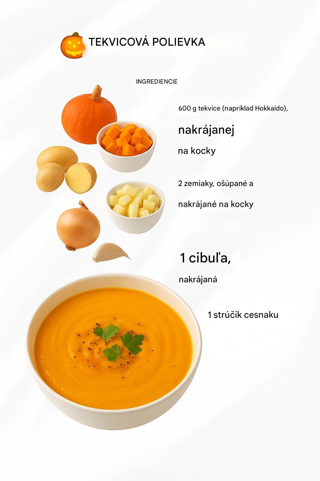 • 600 g tekvice (napr. odrody Hokkaido), nakrájanej na kocky • 2 zemiaky, ošúpané a nakrájané na kocky • 1 cibuľa, nakrájaná • 1 strúčik cesnaku • 1 kúsok zázvoru (cca 2 cm), najemno nastrúhaný • 1 PL oleja • 700 ml zeleninového vývaru • 150 ml smotany alebo kokosového mlieka • Soľ a korenie • Tekvicové semienka a petržlenová vňať na ozdobu