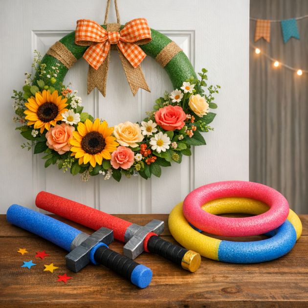 Buďte kreatívni s výzdobou vášho domova a použite rezance z bazéna ako základ pre vence a rekvizity. Ohnite rezance do kruhu a konce zaistite páskou, aby ste vytvorili základ pre veniec. Ozdobte ich kvetmi, stuhami alebo tematickými ornamentmi pre rôzne ročné obdobia. Na večierky sa rezance dajú nakrájať a tvarovať do rekvizít, ako sú meče alebo obruče, čím dodajú vašim dekoráciám hravý nádych. Vďaka svojej nízkej hmotnosti sa ľahko zavesia a premiestnia podľa potreby.
