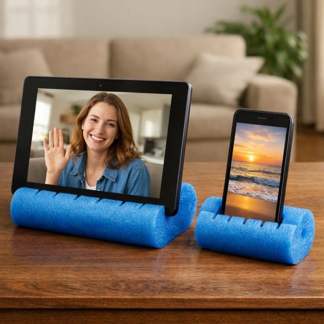 Pozdvihnite svoje zariadenia pomocou vlastného stojana vyrobeného z peny na bazén. Odrežte časť peny a pozdĺžne ju rozrežte, aby ste vytvorili stabilnú základňu. Do vrchnej časti urobte plytké rezy, aby ste zariadenie držali v požadovanom uhle. Pena poskytuje protišmykový povrch, ktorý je šetrný k elektronike. Toto nastavenie je ideálne na videohovory alebo sledovanie videa bez použitia rúk a je dostatočne ľahké na to, aby ste si ho mohli vziať so sebou na cesty. S typickým priemerom približne 7,5 cm poskytuje pena dostatočnú stabilitu pre väčšinu zariadení.