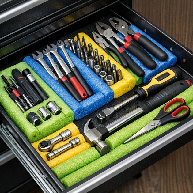 Z bazénových rezancov sa dajú vyrobiť efektívne organizéry do zásuviek a políc. Jednoducho ich nastrihajte na požadovanú dĺžku a použite ich na oddelenie častí v zásuvke alebo na uloženie náradia na mieste. Penová priľnavosť zabraňuje posúvaniu predmetov a poskytuje polstrovaný povrch, ktorý chráni chúlostivé predmety. V prípade náradia rezance nakrájajte pozdĺž jednej strany a omotajte ich okolo rukovätí, aby sa o seba neranili. Túto metódu je možné prispôsobiť akejkoľvek veľkosti zásuvky alebo police, vďaka čomu je to všestranné riešenie pre organizáciu.