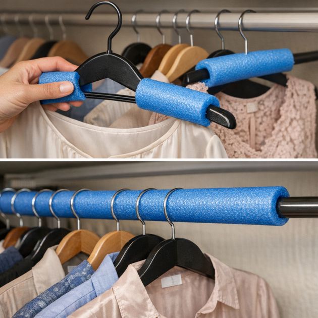 Zabráňte skĺznutiu alebo pokrčeniu oblečenia pomocou bazénových rezancov. Rezance pozdĺžne rozrežte a omotajte ich okolo vešiaka, aby mali pohodlnejší úchop. Prípadne rezance rozrežte a omotajte ich okolo tyče na šatníku, aby ste zabránili prílišnému kĺzaniu vešiakov. Toto je obzvlášť užitočné pre jemné tkaniny, ktoré sú náchylné na šmýkanie alebo pokrčenie. Štruktúra peny poskytuje jemný, ale účinný úchop, ktorý drží oblečenie na mieste bez poškodenia.