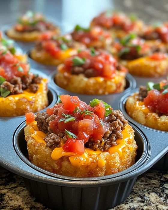 Tacos Tater Tot v plechovke na muffiny sú lahodnou fúziou klasického jedla a mexických chutí. Toto jedlo premieňa obľúbený tater tot, stálicu mnohých domácností na Stredozápade, na chrumkavý zlatý „pohár“, ktorý v sebe skrýva všetky lahodné prvky taco. Tieto malé sústa sú ideálne na zábavnú rodinnú večeru alebo jedinečný predjedlo na párty a sú hravé aj uspokojujúce zároveň. Nápad použiť tater tots ako základ je nielen kreatívny, ale dodáva aj skvelý textúrny kontrast k slanej plnke tacos. Je to jedlo, ktoré vás nabáda k experimentovaniu a užívaniu si procesu varenia.