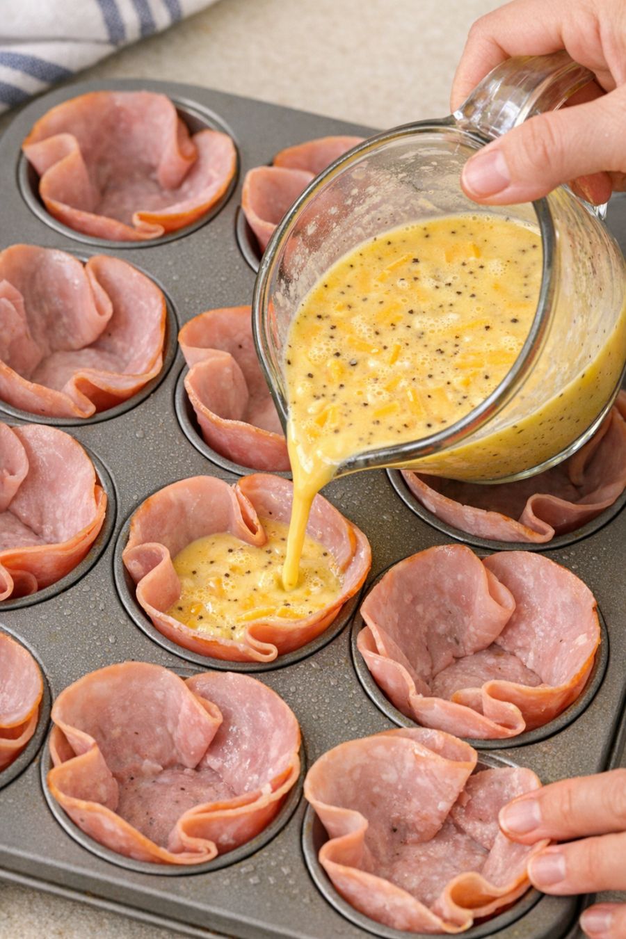 12 tenkých plátkov šunky (okrúhle alebo dostatočne veľké na vystlanie košíčkov na muffiny)