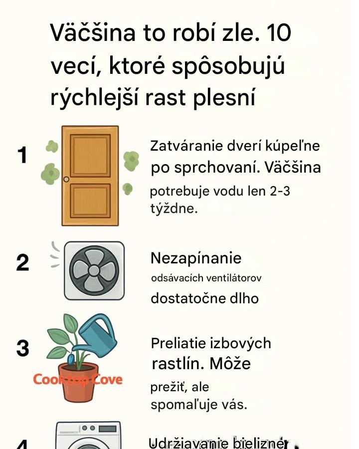 Po horúcej sprche je kúpeľňa plná pary a vlhkosti. Zatvorením dverí sa táto vlhkosť zachytáva a vytvára sa ideálne prostredie pre vznik plesní. Spóry plesní sa darí v prostredí s vlhkosťou nad 60 %. Ponechaním dverí otvorených umožňujete vlhkosti rozptýliť sa, čím sa znižuje vlhkosť a riziko rastu plesní.