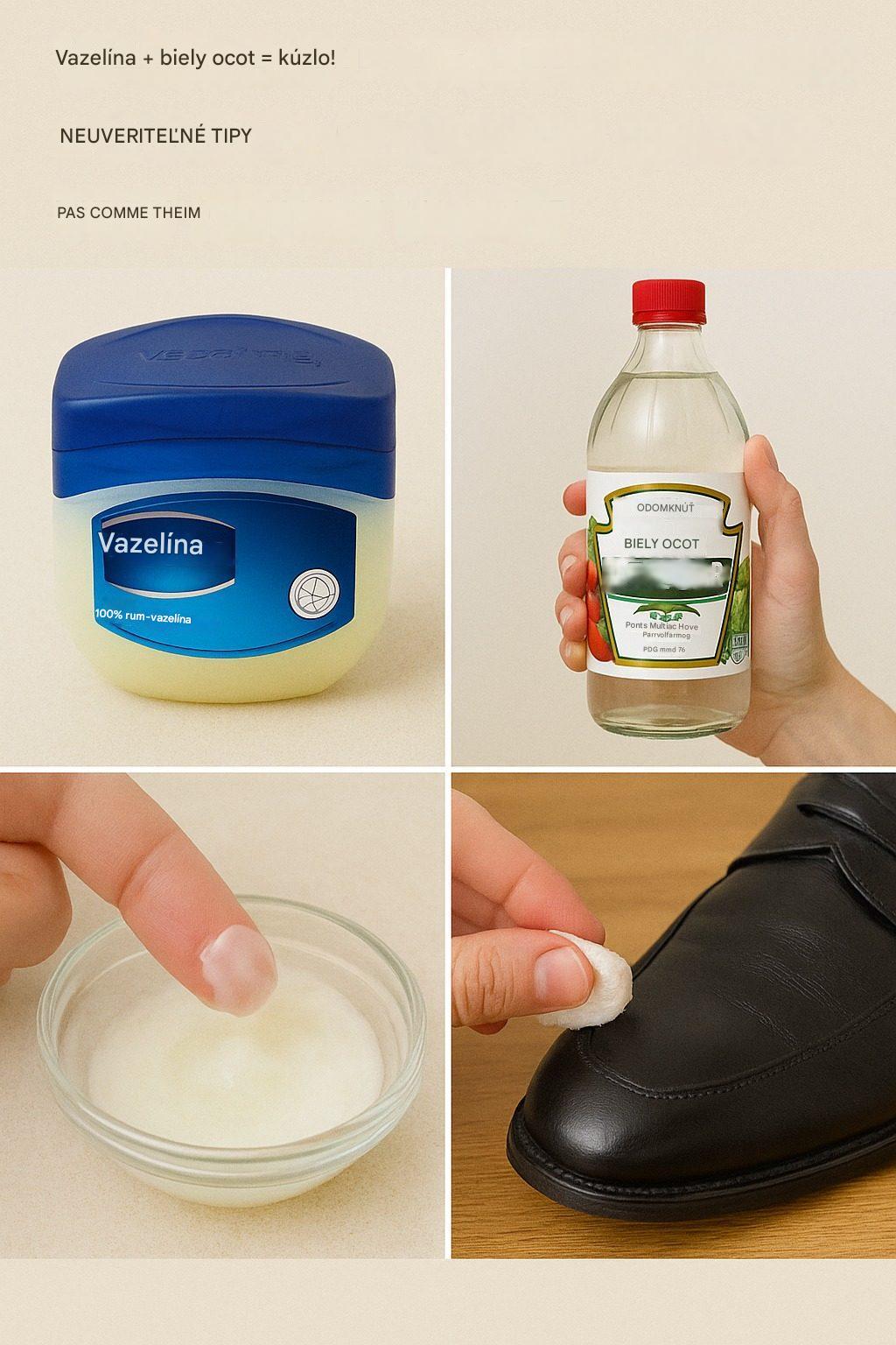 Zažili vaše kožené výrobky, ako sú topánky, tašky alebo nábytok, lepšie časy? Môžete ich oživiť jednoduchou zmesou vazelíny a bieleho octu. Tu je postup: