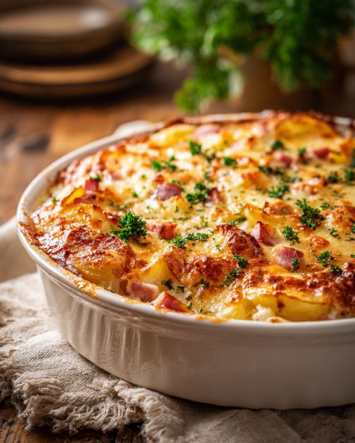 Tento chutný zapekaný zemiak so šunkou a syrom je v našej domácnosti obľúbeným jedlom celej rodiny. Je to klasické jedlo stredozápadnej kuchyne, ktoré zahreje pri srdci a zasýti žalúdok. Vrstvy jemných zemiakov, kúsky slanej šunky a mäkký syr sa spoja a vytvoria jedlo, ktoré určite poteší. Toto jedlo je ideálne na zužitkovanie zvyšnej šunky, je ekonomické aj uspokojujúce, vďaka čomu je obľúbeným miestom na stretnutia aj večere počas týždňa.