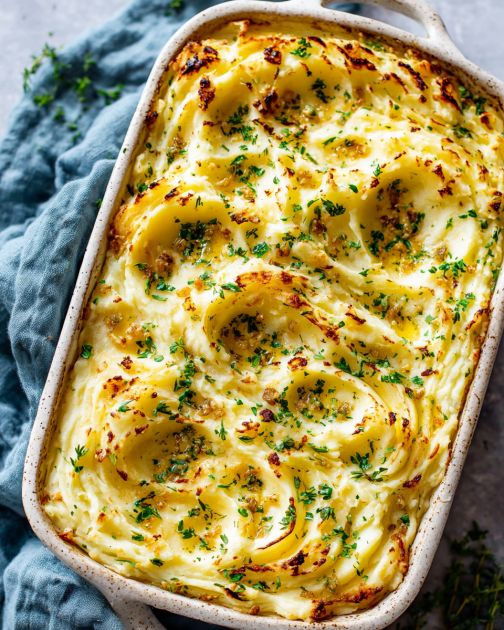 Táto zapekaná zemiaková kaša s cesnakovým maslom sa prirodzene hodí k jednoduchým bielkovinám, ako je pečené kuracie mäso, pečený losos alebo bravčové kotlety opečené na panvici. Krásne sa hodí aj k mäsovej roštenke alebo dusenému mäsu, ak sa prikláňate k plnému pohodovému jedlu. Pre vyváženosť rada pridávam niečo zelené a čerstvé – predstavte si chrumkavý šalát s pikantnou vinegretou, pečené zelené fazuľky alebo dusenú brokolicu s kvapkou citróna. Ak toto jedlo podávate na sviatočnú alebo nedeľnú večeru, skvele sa hodí k omáčke, brusnicovej omáčke a pečenej zelenine. A úprimne, počas veľmi rušných večerov som z neho urobila hlavnú udalosť pridaním rýchleho zeleného šalátu a nejakej mrazenej zeleniny – žiadne sťažnosti pri stole.