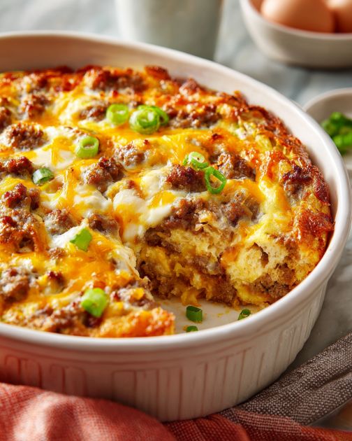 Tento kastról je dostatočne výdatný na to, aby stál samostatne, ale ešte viac vynikne s niekoľkými jednoduchými prílohami. Rada ho servírujem s miskou čerstvého ovocia – plátkami pomaranča, hroznom alebo čímkoľvek, čo je v sezóne – aby som na tanier vniesla trochu žiarivosti. Hrianky alebo teplé sušienky s maslom a džemom sa k nemu cítia ako doma, najmä v chladné ráno. Ak chystáte kŕmiť väčšiu skupinu, panvica škoricových roliek alebo jednoduchý kávový koláčik, plus veľká kanvica kávy a džbán pomarančového džúsu, premenia toto jedlo na farmárske raňajky, ktoré sa budú chcieť podávať až do neskorého rána.
