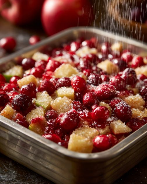Tento sviatočný kastról s brusnicami a jablkami je ten typ jednoduchého a nenáročného jedla, ktoré sa objavuje na stoloch Stredozápadu už celé generácie, zvyčajne načmárané na starú receptovú kartu a zastrčené v zadnej časti kuchárskej knihy v kostole. Má len štyri ingrediencie, ale chutí ako to najlepšie z sezóny – kyslasté brusnice, útulné jablká a maslová sladkosť, ktorá bublá po okrajoch panvice. Ľudia v okolí ho zvykli pripravovať, keď sa prvé čerstvé brusnice dostali do malého obchodu s potravinami v meste a jablká boli ešte chrumkavé z miestnych sadov. Je to ten typ receptu, ktorý vytiahnete, keď je dom plný, rúra je už teplá od morčacieho mäsa alebo šunky a potrebujete ešte jednu žiarivú, slávnostnú prílohu, ktorá si nevyžaduje veľa pozornosti. Niekto ho možno pripraví, pretože premosťuje medzeru medzi prílohou a dezertom, pretože sa dobre hodí na spoločné večierky, alebo jednoducho preto, že chutí tak, ako by mali byť sviatky: známe, upokojujúce a trochu špeciálne.