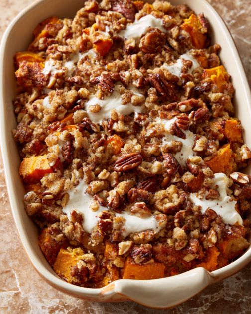 Tento sladký sviatočný tekvicový kastról sa krásne hodí k pečenému hydinovému mäsu – predstavte si morčacie, kuracie alebo dokonca jednoduché pečené kuracie prsia počas pracovného týždňa. Pohodlne sa hodí aj k glazovanej šunke alebo bravčovej panenke, kde jemná sladkosť tekvice vyvažuje slané a pikantné chute. Pre plnohodnotnú vegetariánsku pochúťku ho podávajte spolu s cesnakovo restovanou zeleninou, žiarivým citrusovým šalátom alebo pečeným ružičkovým kelom, ktoré dodajú kontrast a textúru. Keďže je mierne sladký, dobre sa hodí k pikantnej brusnicovej omáčke, pikantným nakladaným uhorkám alebo čomukoľvek s trochou kyslosti, aby tanier ožil.