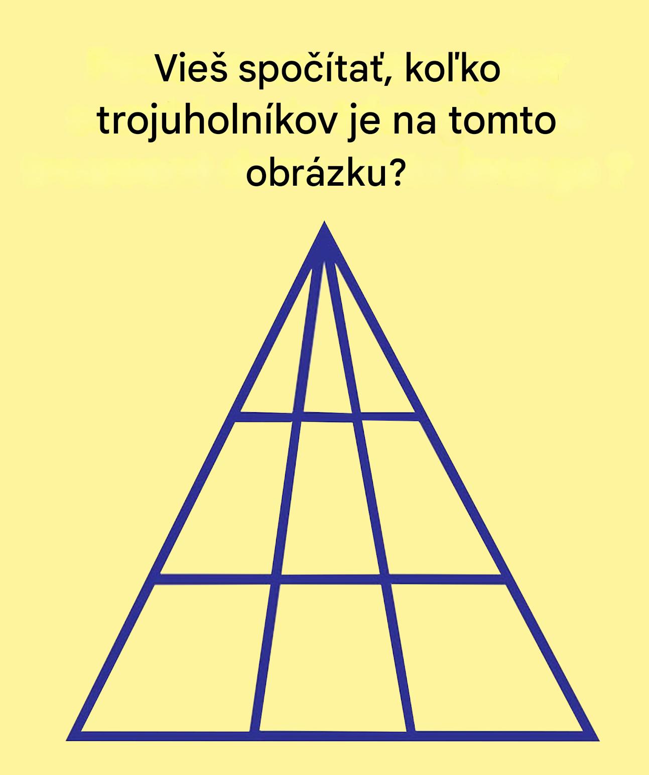 Narazíte na jednoduchý, takmer detský obrázok: trojuholník rozdelený na niekoľko častí. Ste sebavedomí, takmer pobavení. Je položená otázka: „Koľko trojuholníkov vidíte?“ Jednoduché, však? A predsa… keď sa objaví odpoveď, je to prekvapenie. Mýlite sa. Ako drvivá väčšina účastníkov britskej televíznej kvízovej šou Club 1%, kde uspieť dokážu len tí najpozornejší. Čo teda robí túto hádanku takou skľučujúcou?