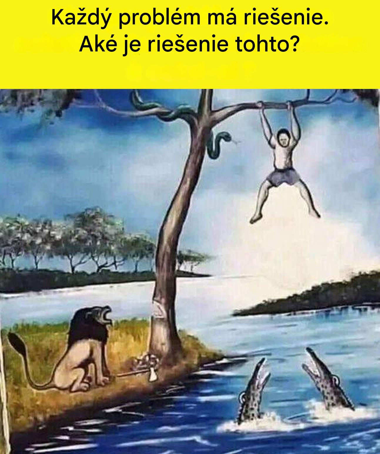 1) Muž uväznený medzi hadom, stromom, levom a krokodílmi