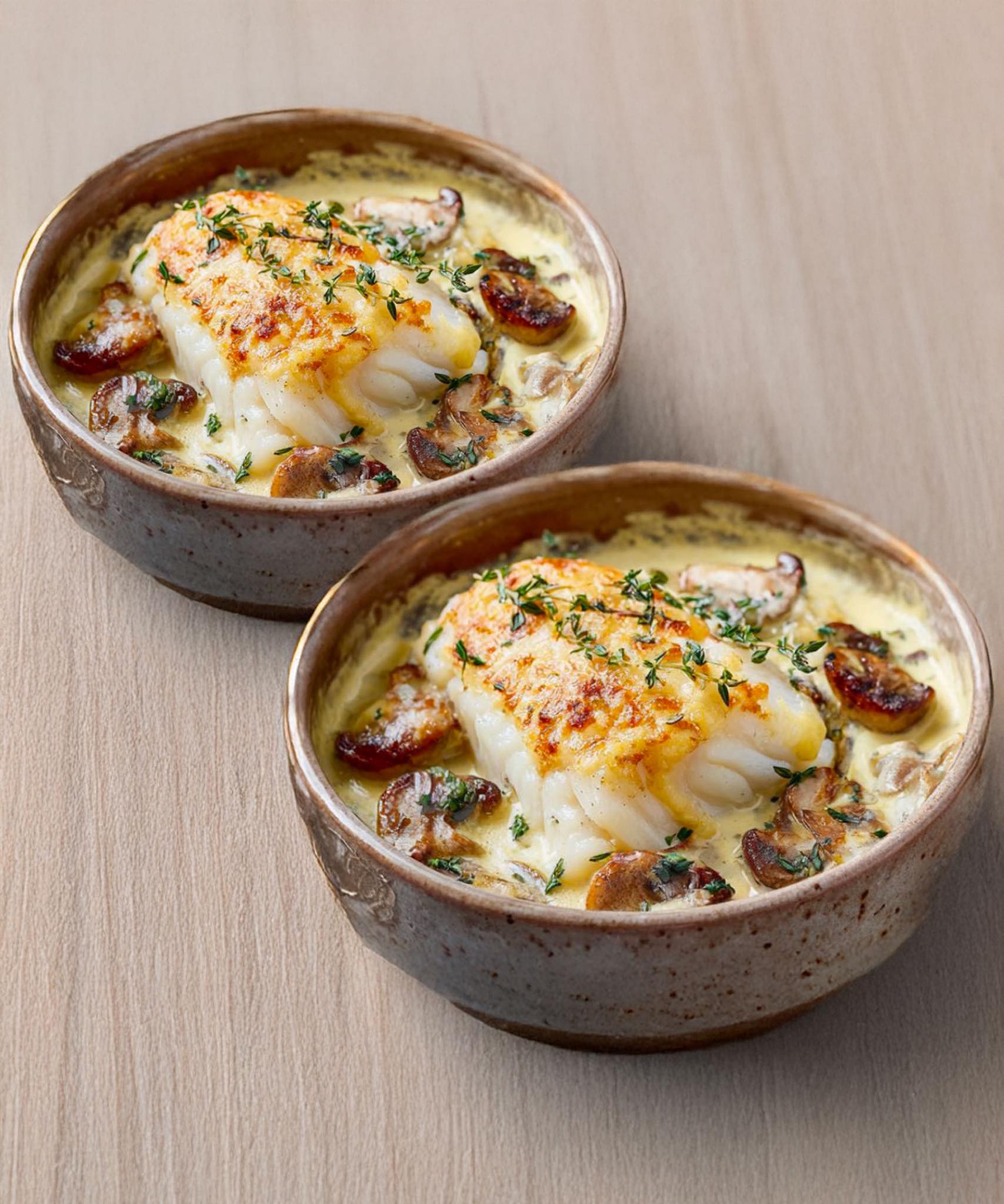 V tomto recepte sa treska podáva v lahodných, krémových kastróloch, ktoré spájajú jemné chute s bohatosťou. Kombinácia krehkej ryby s jemnou, voňavou smotanovou omáčkou vytvára dokonalú rovnováhu chutí. Huby dodávajú jedlu jemnú zemitú chuť, ktorá umocňuje upokojujúci charakter jedla.